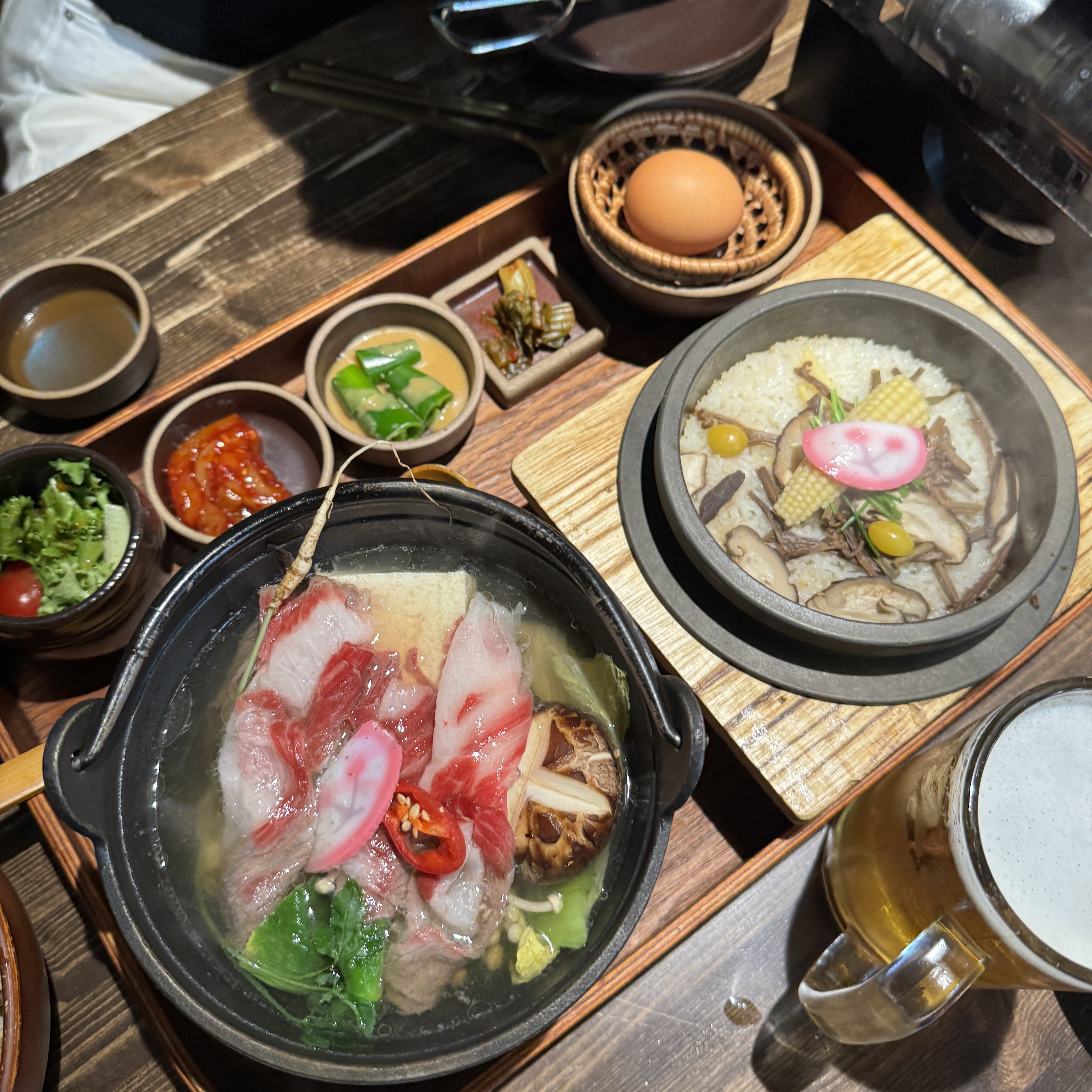 곤드레 토마토 솥밥은 바질 오일? 같은 소스를 주시고 고사리 표고 솥밥은 간장같은 소스를 주셔서 부어서 취향대로 조절해서 먹으면 됩니다. 솥밥은 퍼놓고 물을 부어서 기다렸다가 숭늉을 먹을 수 있고, 함께 나오는 날계란은 스끼야끼 먹을 때 처럼 풀어서 고기를 찍어 먹는데 쓰면 됩니다!