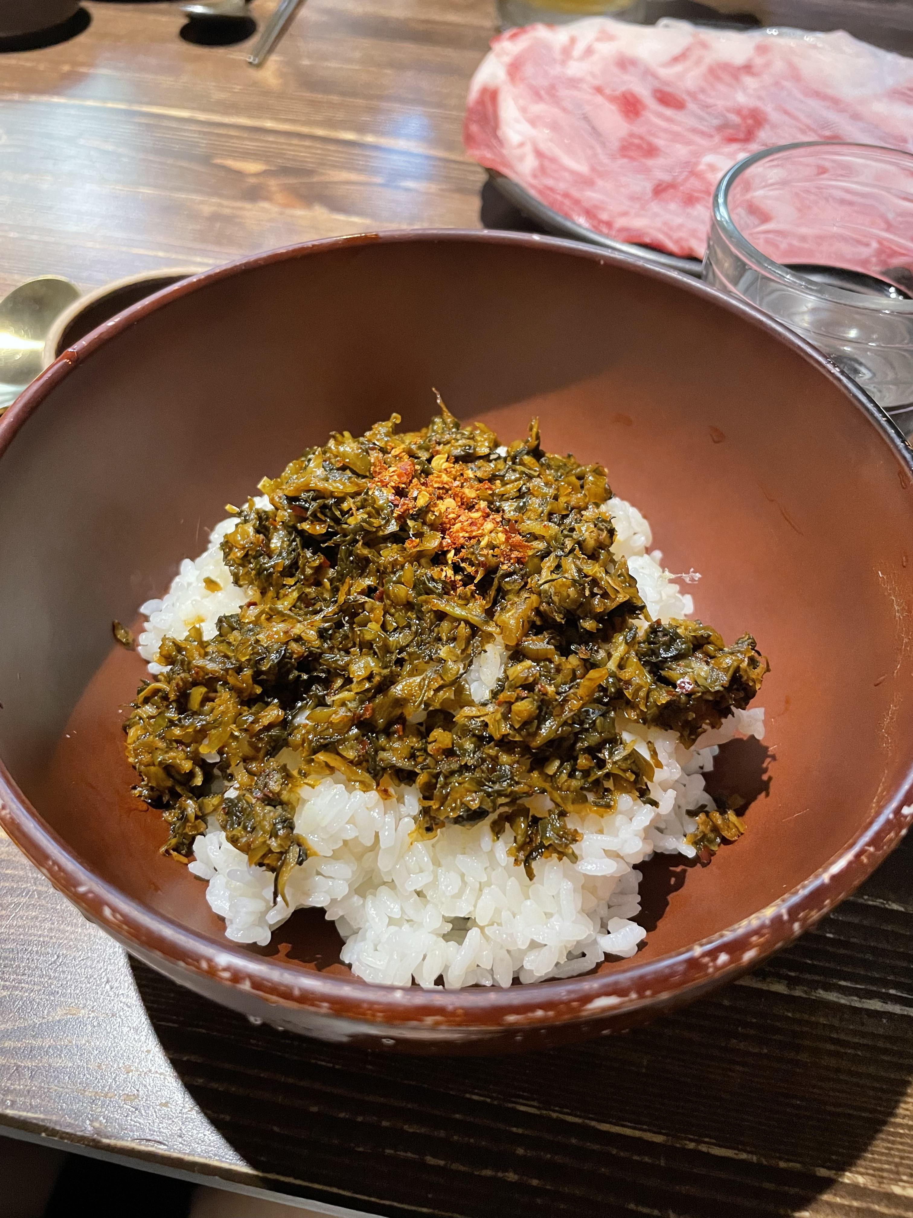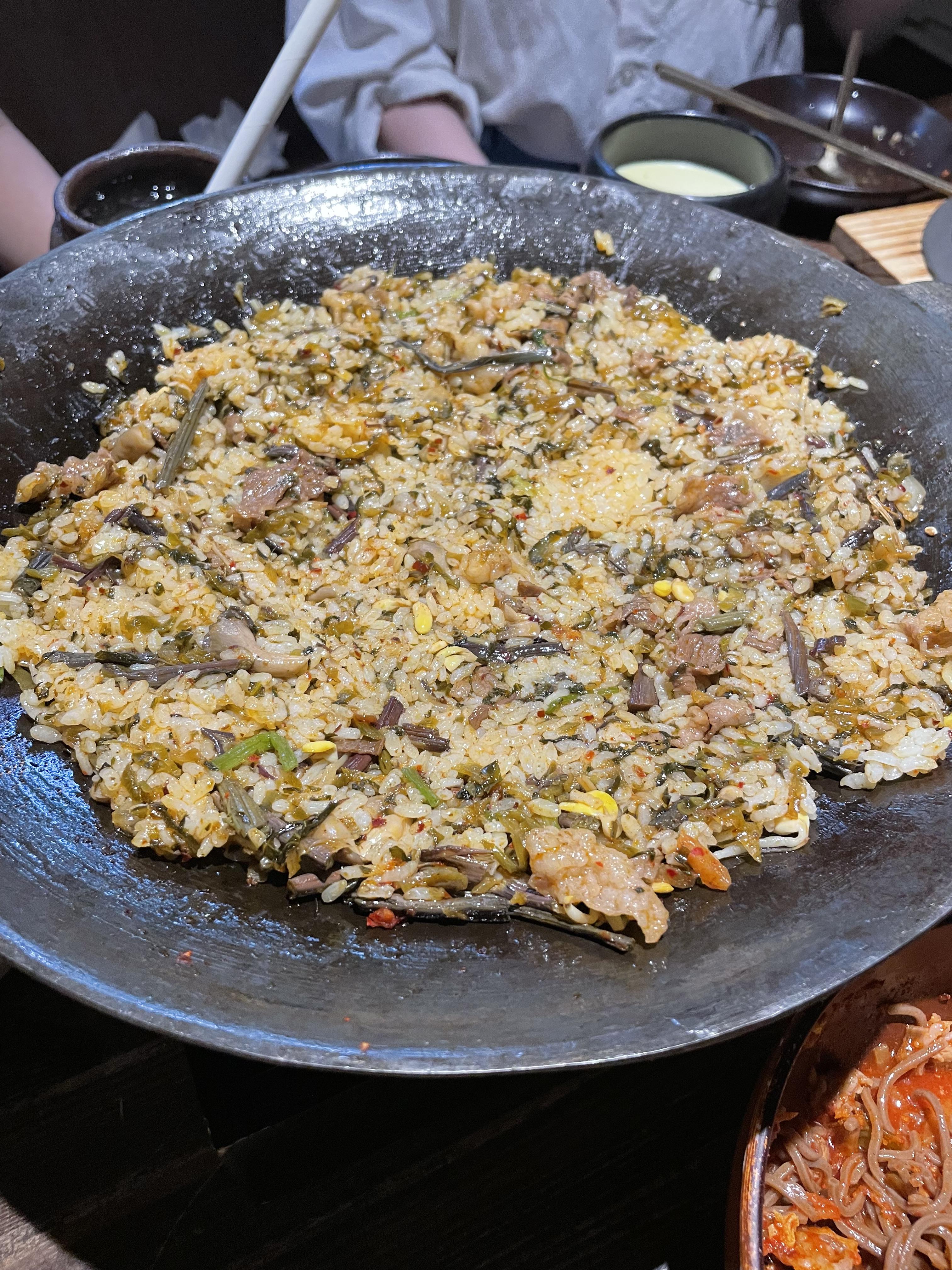 우물집 특선 한상차림에는 요 갓김치 볶음밥이 포함되어 있는데요, 삼합을 구워 먹고 그 판에 볶아먹으면 됩니다ㅎㅎ