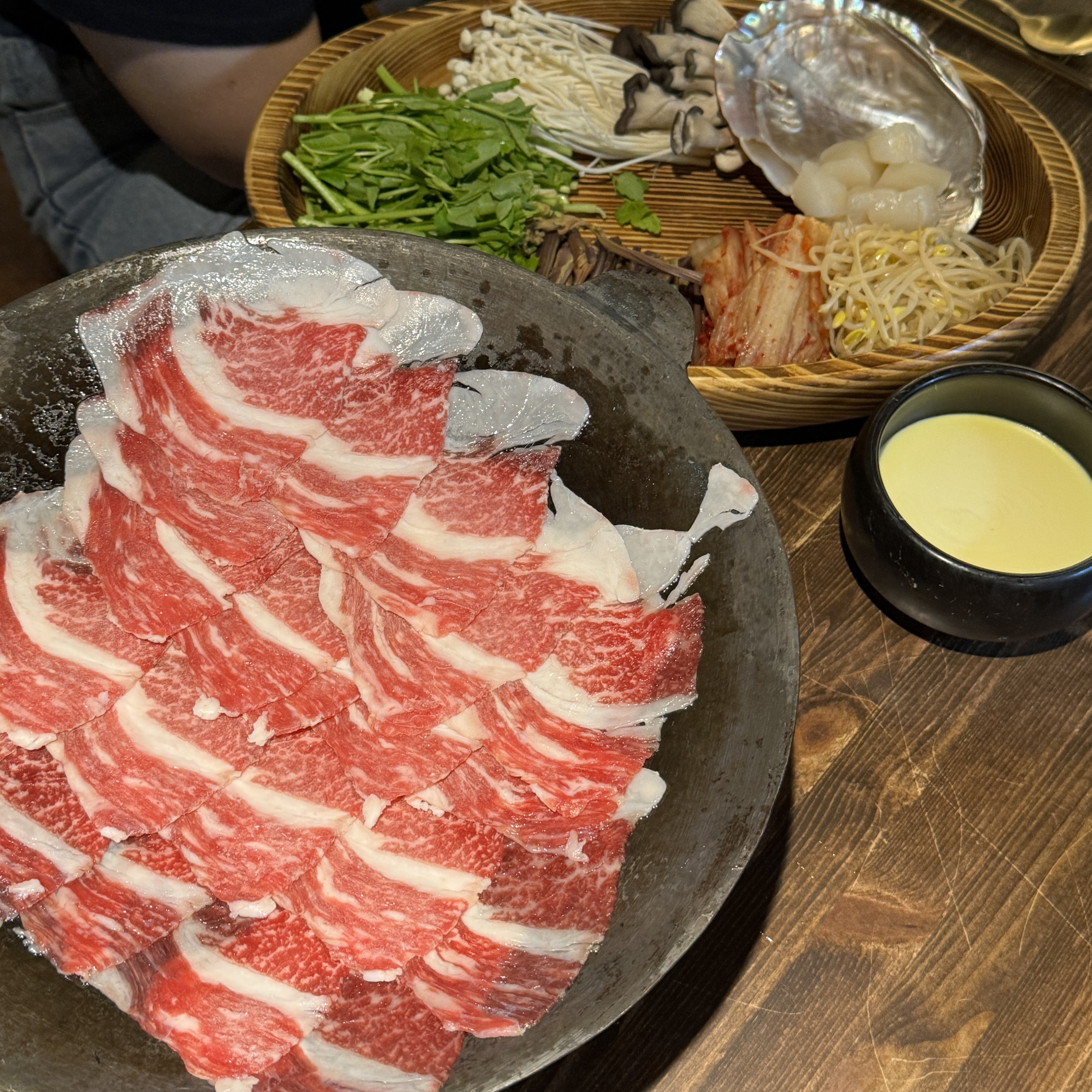 기본적으로 삼합 + 전골/솥밥 2개 + 우삼겹 눈꽃튀김 + 삼합 후 볶아먹는 볶음밥 2개 + 식혜 4잔이 나오는데 저희는 아래와 같이 변경했습니다!