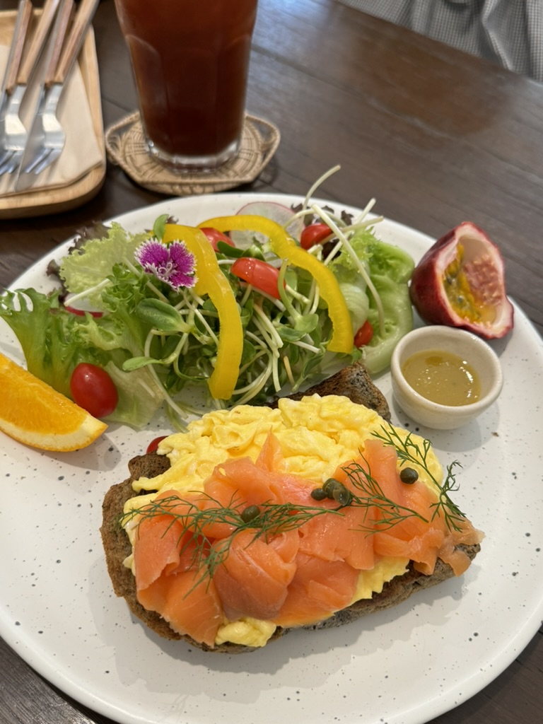 엄마가 비건이라, 두부 샐러드를 시키고, 우리는 믹스베리 스무디볼, 스크램블에그와 훈제연어 토스트를 시켰다.