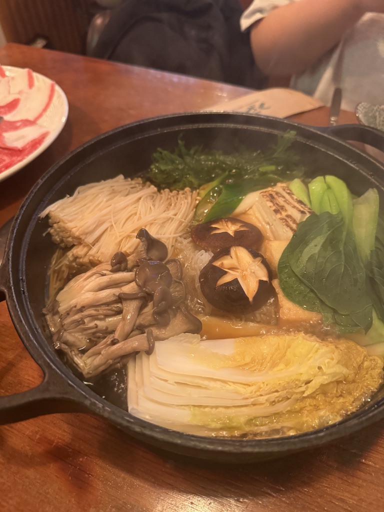 스키야키 구성은 실곤약, 표고, 팽이, 느타리, 배추, 청경채, 쑥갓이 들어가 있어요!