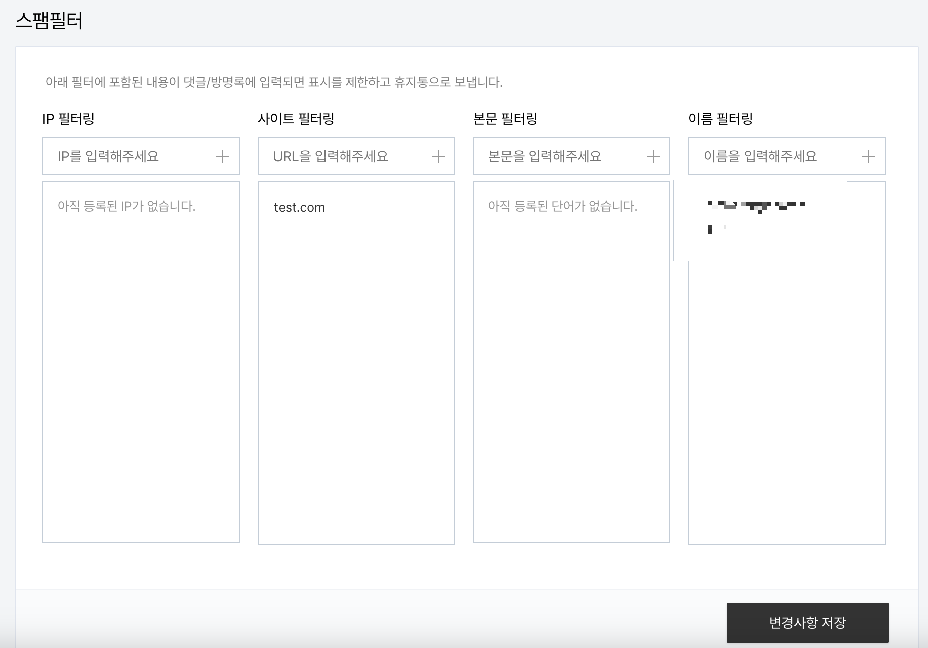 - 이름 필터링 : 티스토리 이름을 기준으로 차단한다. 그런데 이 기능의 허점의 경우... 매크로 사용자가 이름을 바꾸면 작성할 수 있는 거 아닌가? 하는 생각이 들었다.