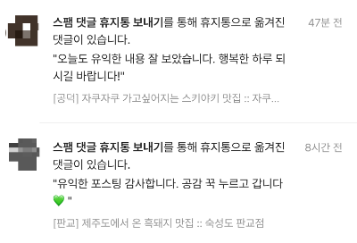 으아니 티스토리 양반,, 이런 고마운 분들을 스팸 처리 하면 어떡해욧ㅠ