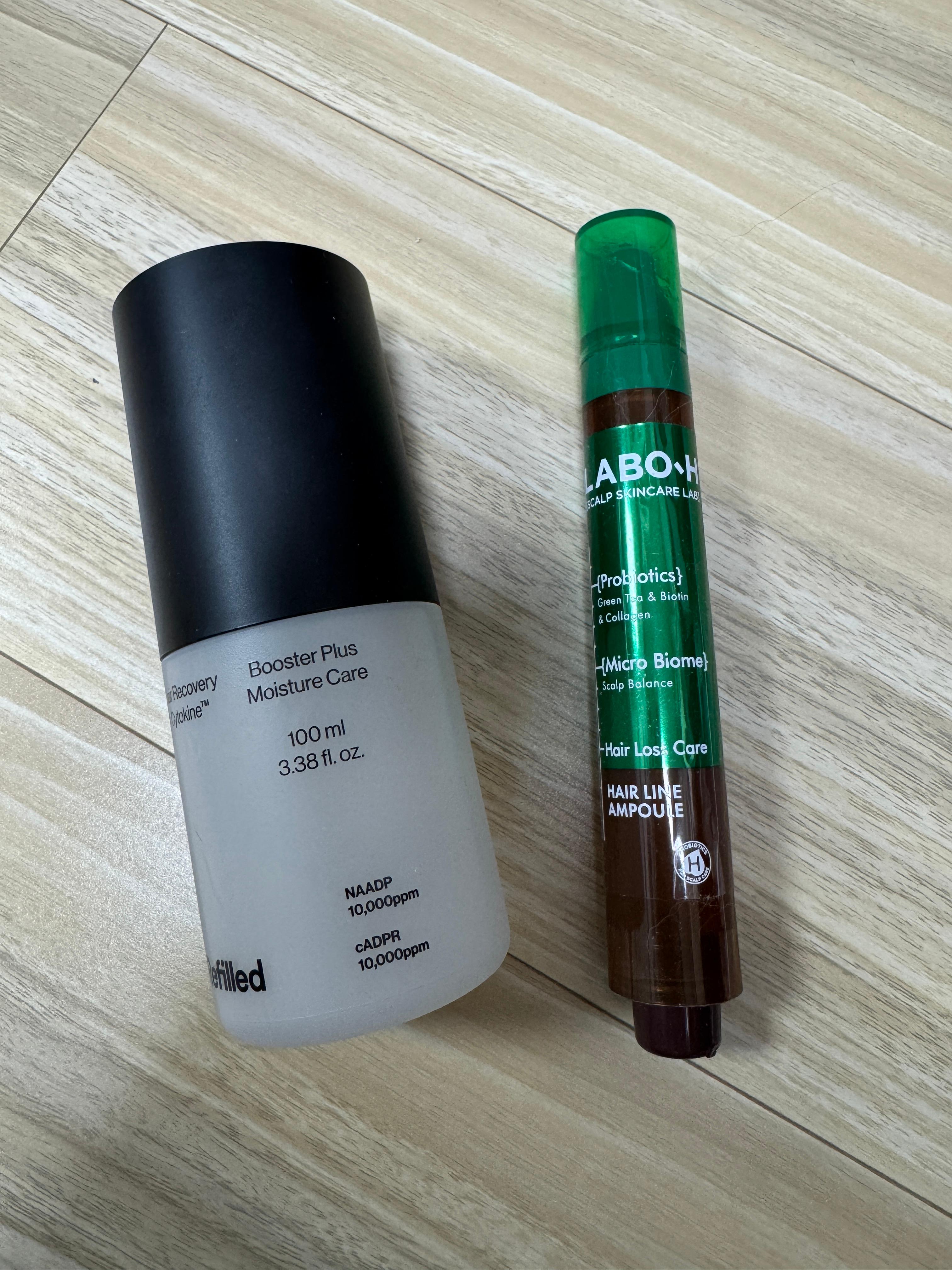 왼쪽이 리필드 사이토카인 부스터, 오른쪽이 라보에이치 두피강화클리닉 헤어라인 앰플입니다.