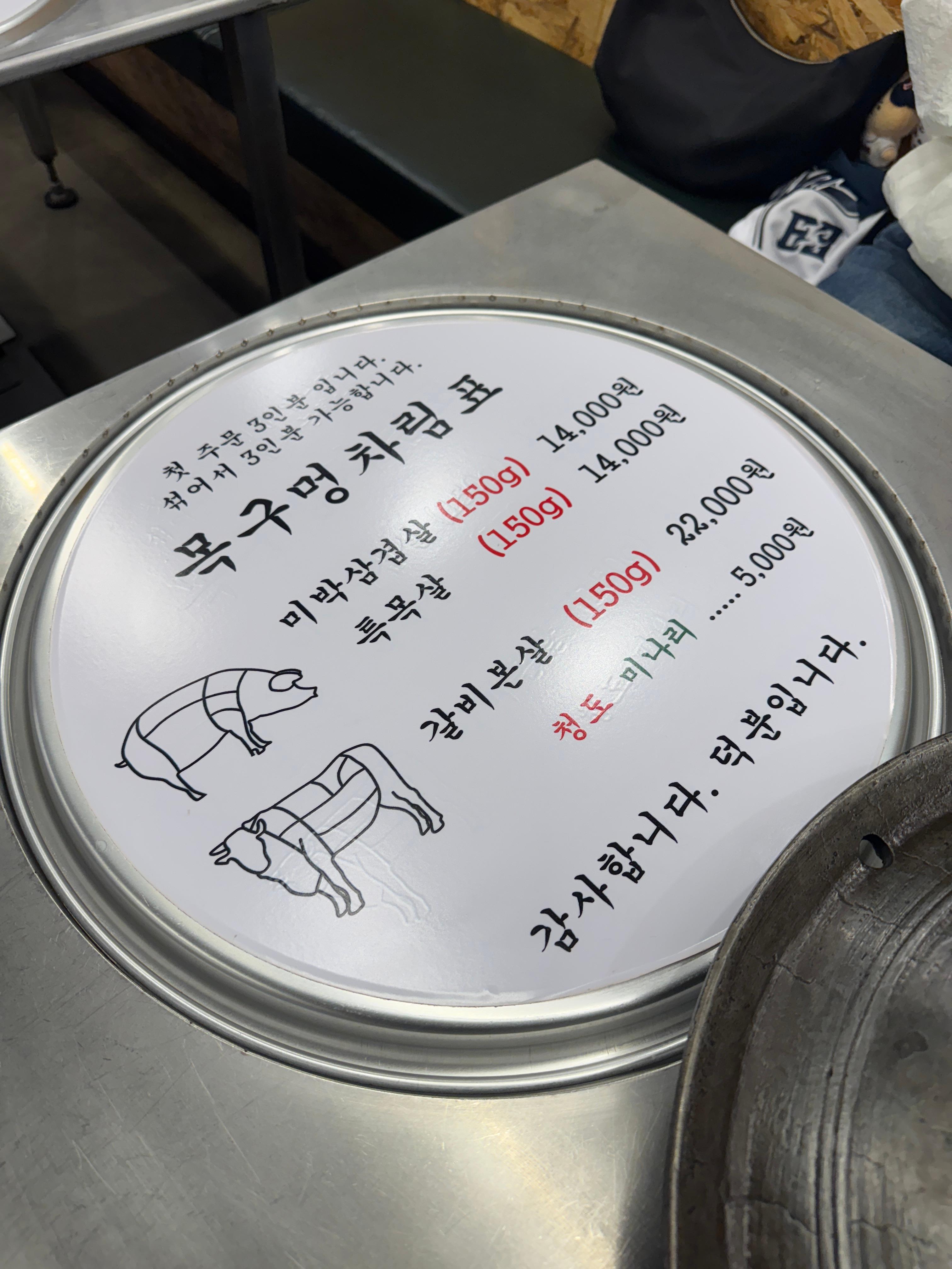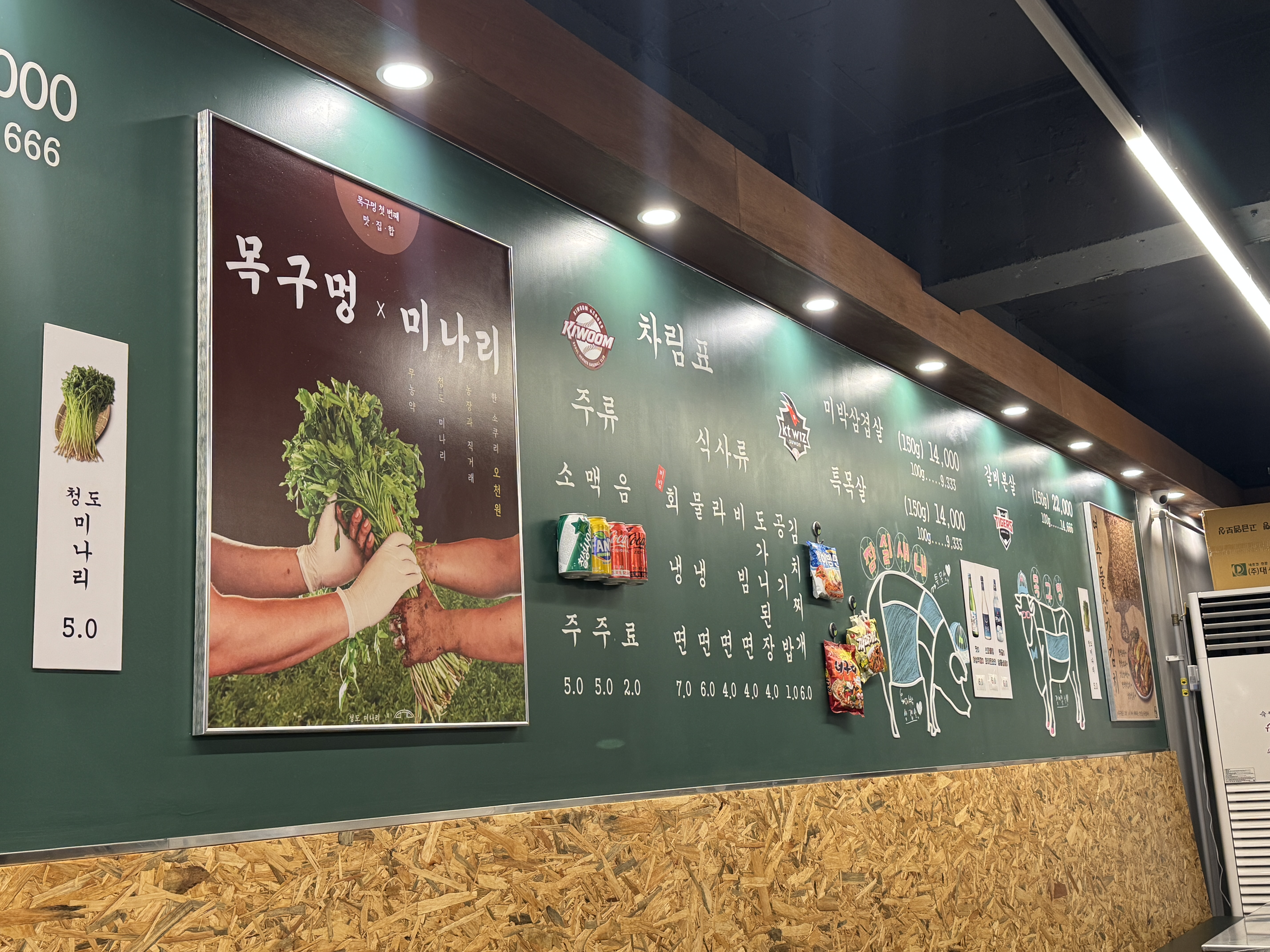 고기류 차림표는 자리마다 쟁반에 적혀있고, 벽면에는 주류랑 식사류 메뉴판이 적혀있습니다!