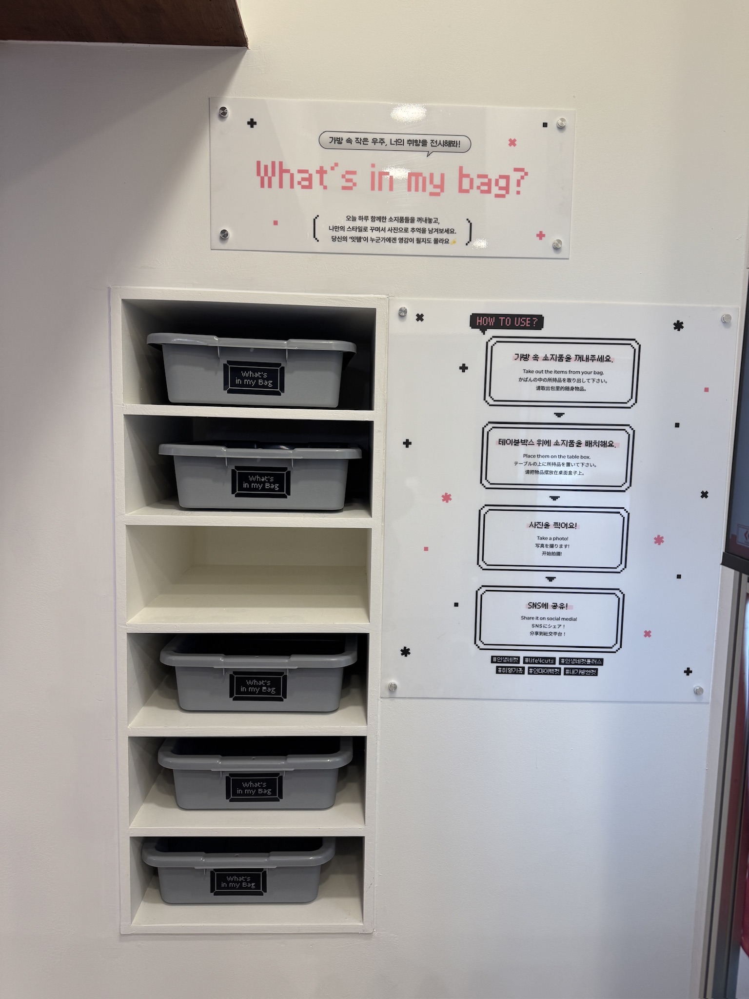 진짜 물고기들이 있는 예쁜 바다 테마의 방도 있고, 힙하고 귀여운 소지품이 많으시다면 왓츠인마이백을 찍을 수 있는 별도의 사진기도 있었습니다!