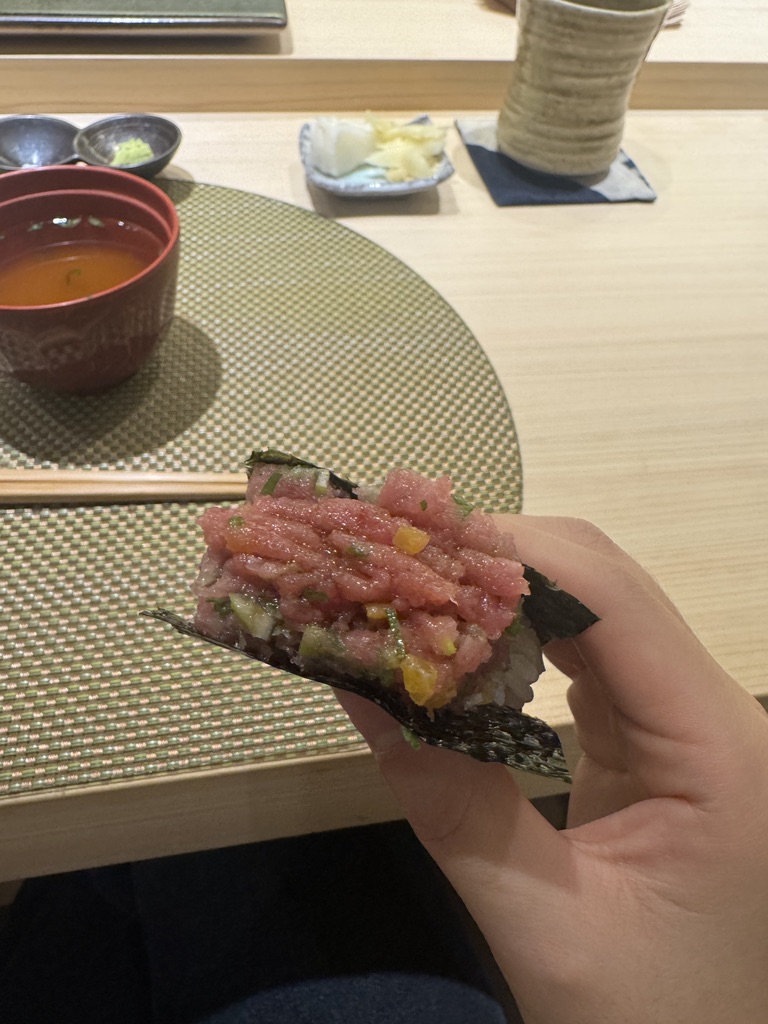 저는 아삭아삭한 그 냉동 참치는 별로 좋아하지 않지만, 저런 빨간색이 많은 부위의 참치는 아주 좋아합니다.