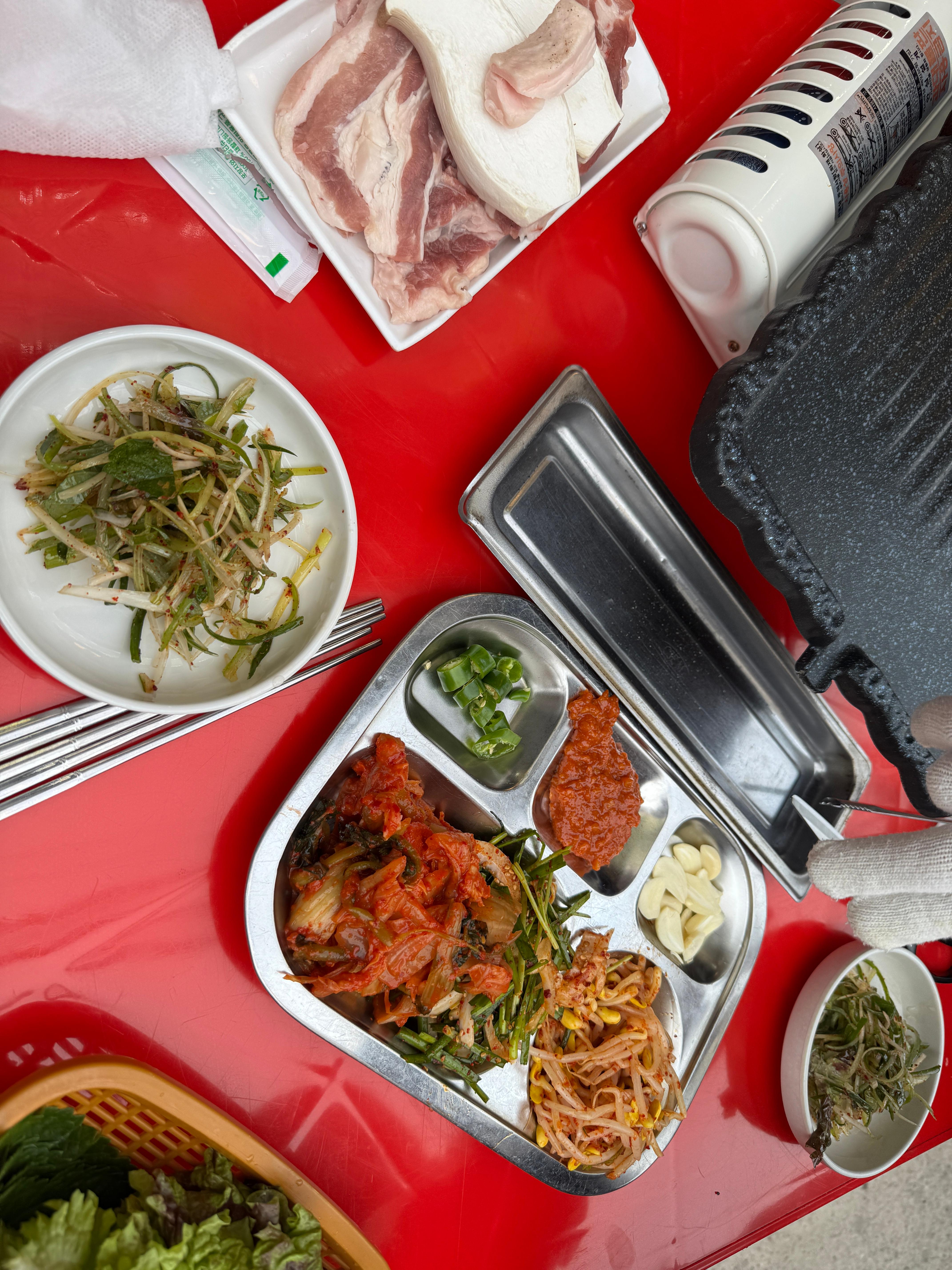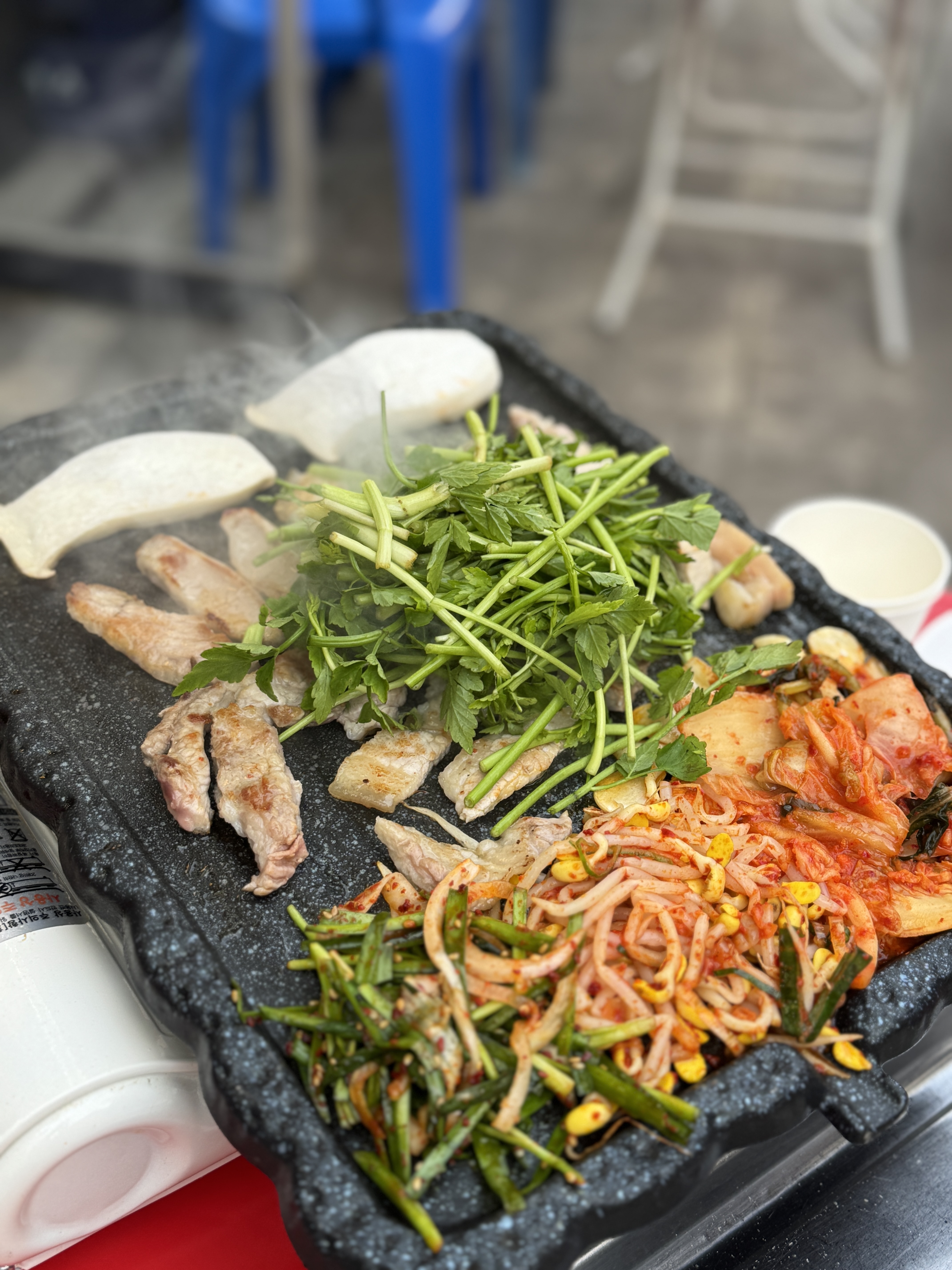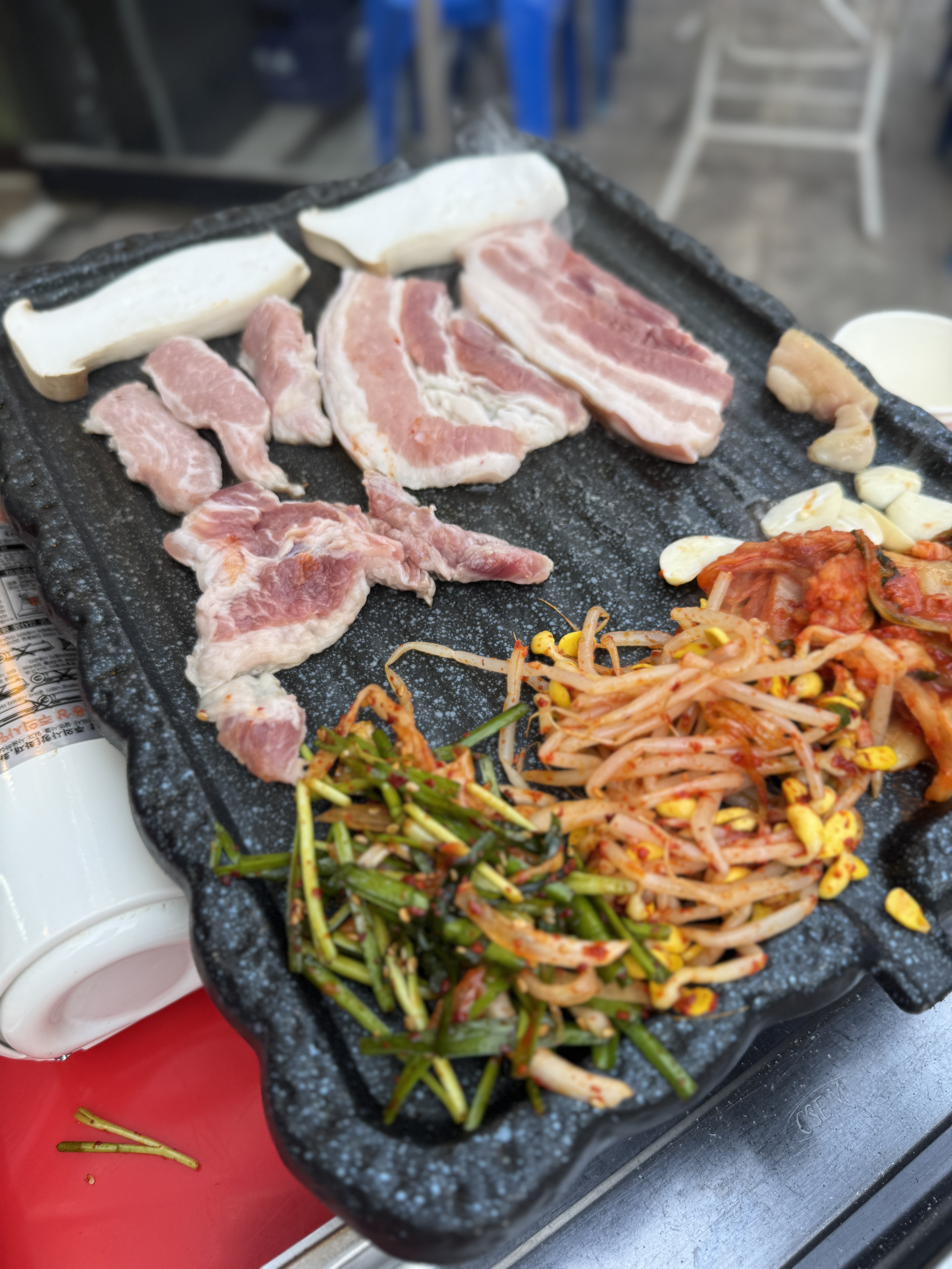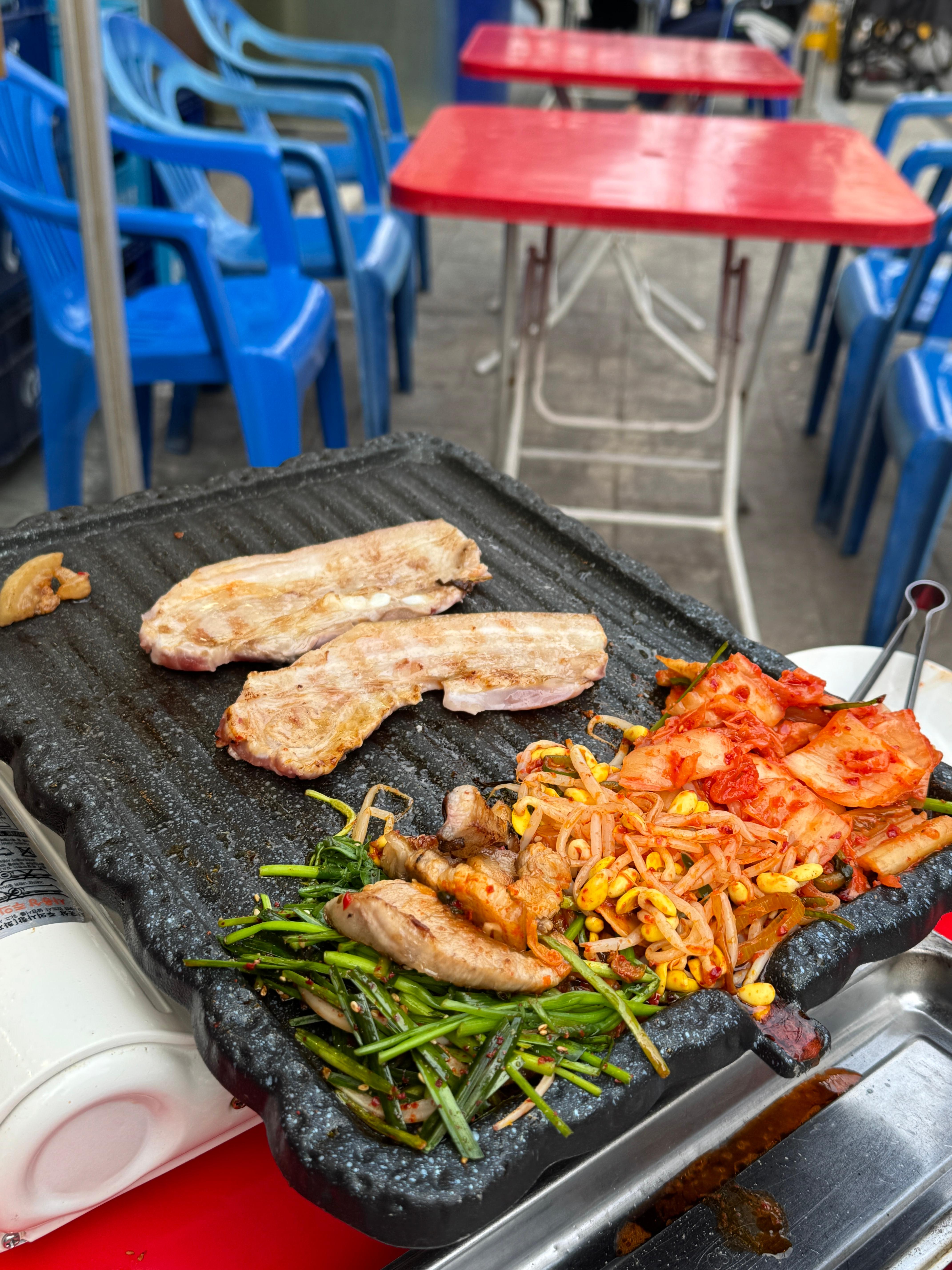 불판에 고기를 올리고 부추, 콩나물, 김치를 올려주면 캬아아ㅠㅠㅠㅠ