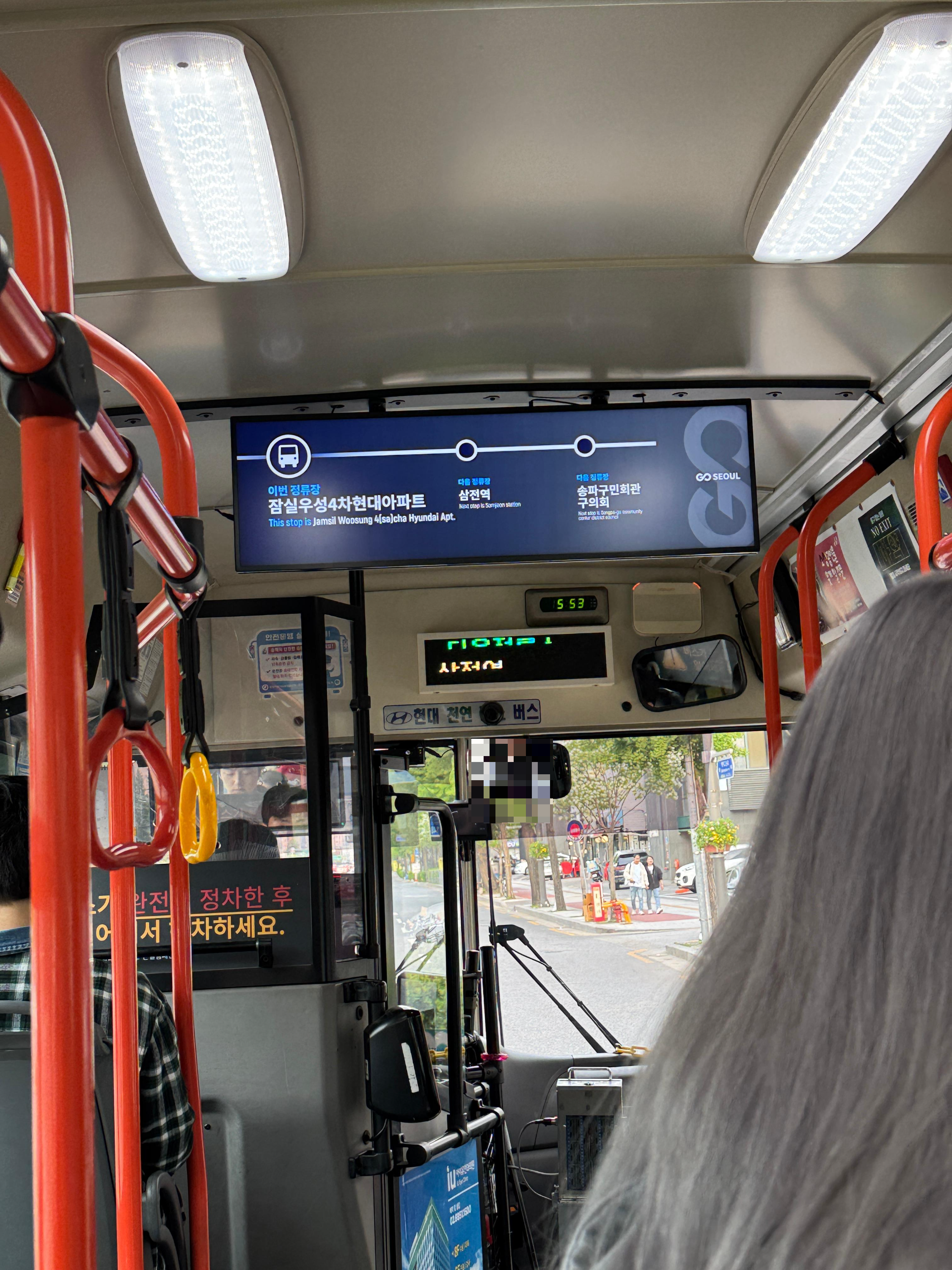 종합운동장 4번 출구에서 버스를 타고갔어요!