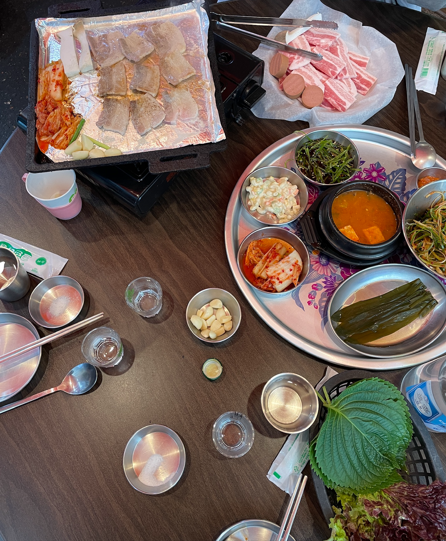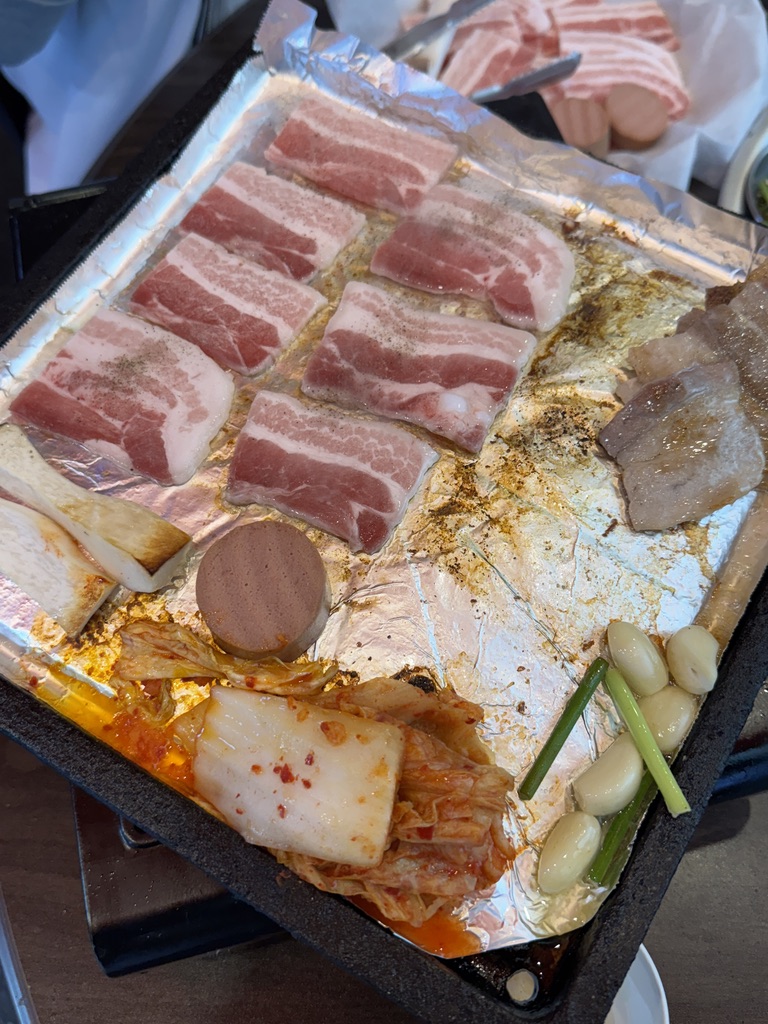 은박지 깔린 불판에 냉삼, 김치, 마늘, 버섯 올리고