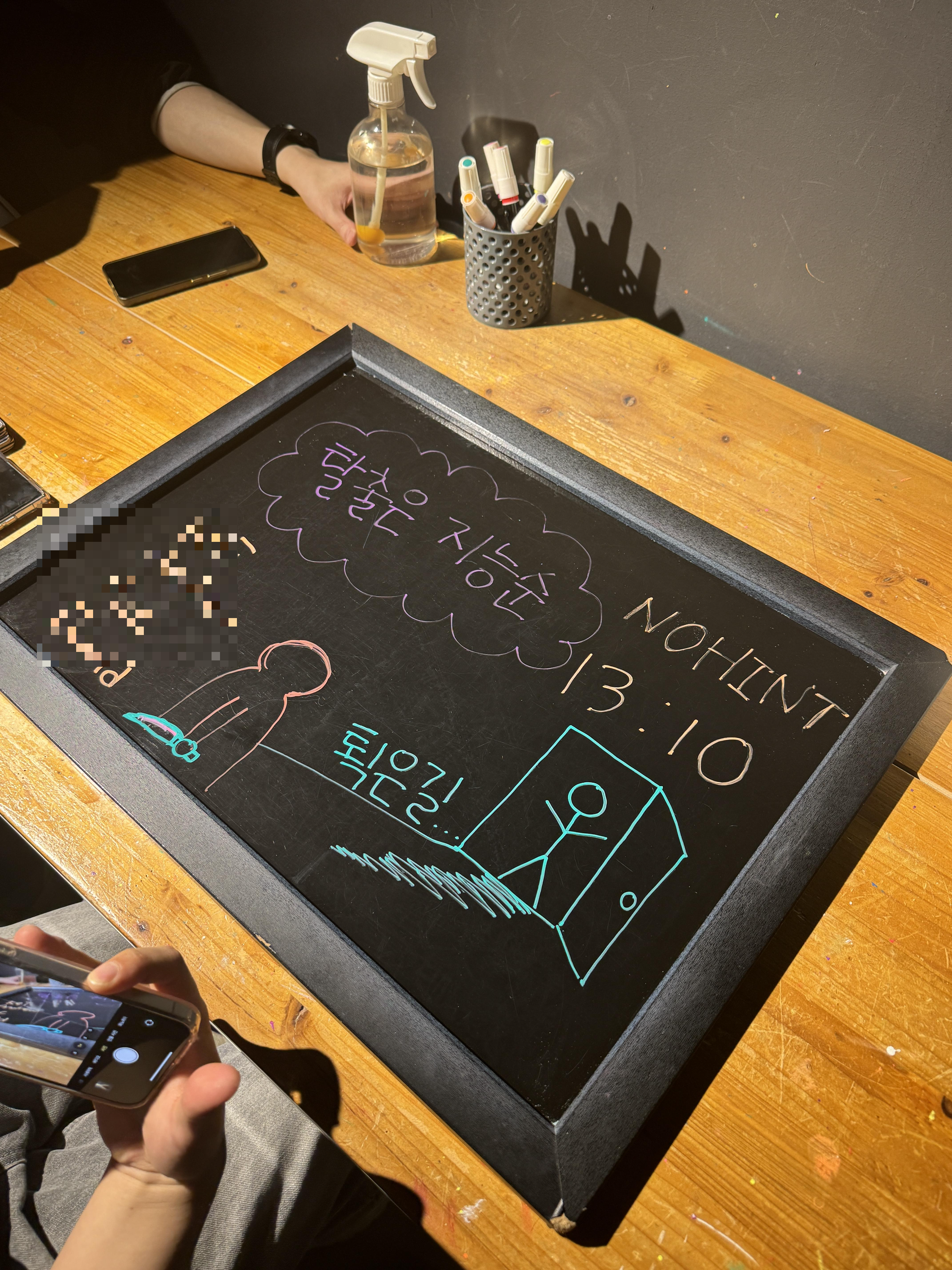 해줘 놈즈랑 고민하다가 이게 좀 더 난이도가 높아서 하씨 심부름센터를 하고왔다! 1인당 23,000원저 설명글을 보고 사실 다른 스토리를 예상했는데, 내 생각이 좀 빗나갔다.역시나 멋있는 로비!시간마다 갤럭시 익스프레스 테마에서 기차 경적 소리가 나서 너무 해보고싶었다. 결과는 성공!100방러 두분과 함께해서인지 문제가 쉬운 편이 아닌데, 엄청나게 빠르게 탈출했다ㅋㅋㅋ1힌트에 17분정도 남긴 것 같다. 스토리★★★스토리는 특별히 엄청 좋진 않지만 빈 구멍도 없다!난이도★★★★무조건 한번은 꼬는데 그게 과하지 않다.들어보면 납득은 되는...힌트의 연관성을 주변에서 잘 찾는것이 중요하다!활동성★★활동성은 그렇게 크지는 않다. 치마도 괜찮을 정도!공포도-없음!장치 : 자물쇠 비율6:4적-절총점★★★★티켓..